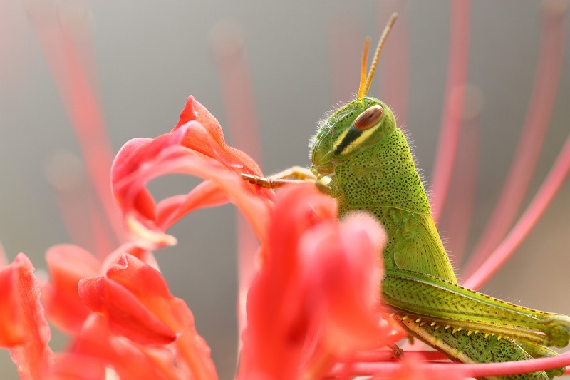 彼岸花にちんまりといるバッタ見つけて大喜び♪